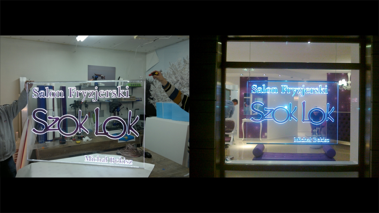 Prezenter świetlny wykonany został z #6 mm plexy bezbarwnej w której została wygrawerowana po obrysie grafika. Wypełnienie okularów zostało wykonane z folii translucentnej do podświetleń. Na górze płyty została zamontowana ramka w której umieszczono oświetlenie LEDowe w kolorze różowym.